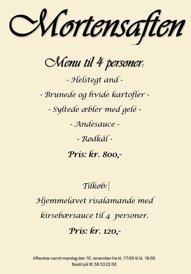 Vi gentager succesen og laver igen i år Mortens And samt tilbehør ud af huset til Mortensaften mandag den 10/11-2025.