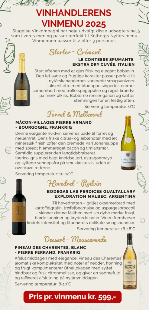 Igen i år samarbejder vi med Slagelse Vinkompagni, som har sammensat den perfekte vinmenu, der er skræddersyet og afstemt til vores 5-retters nytårsmenu. Disse udsøgte vine fremhæver smagsnuancerne i hver ret og skaber en udsøgt oplevelse til at skyde det nye år i gang. Vinmenuen er tilpasset til 2-3 personer og indeholder: